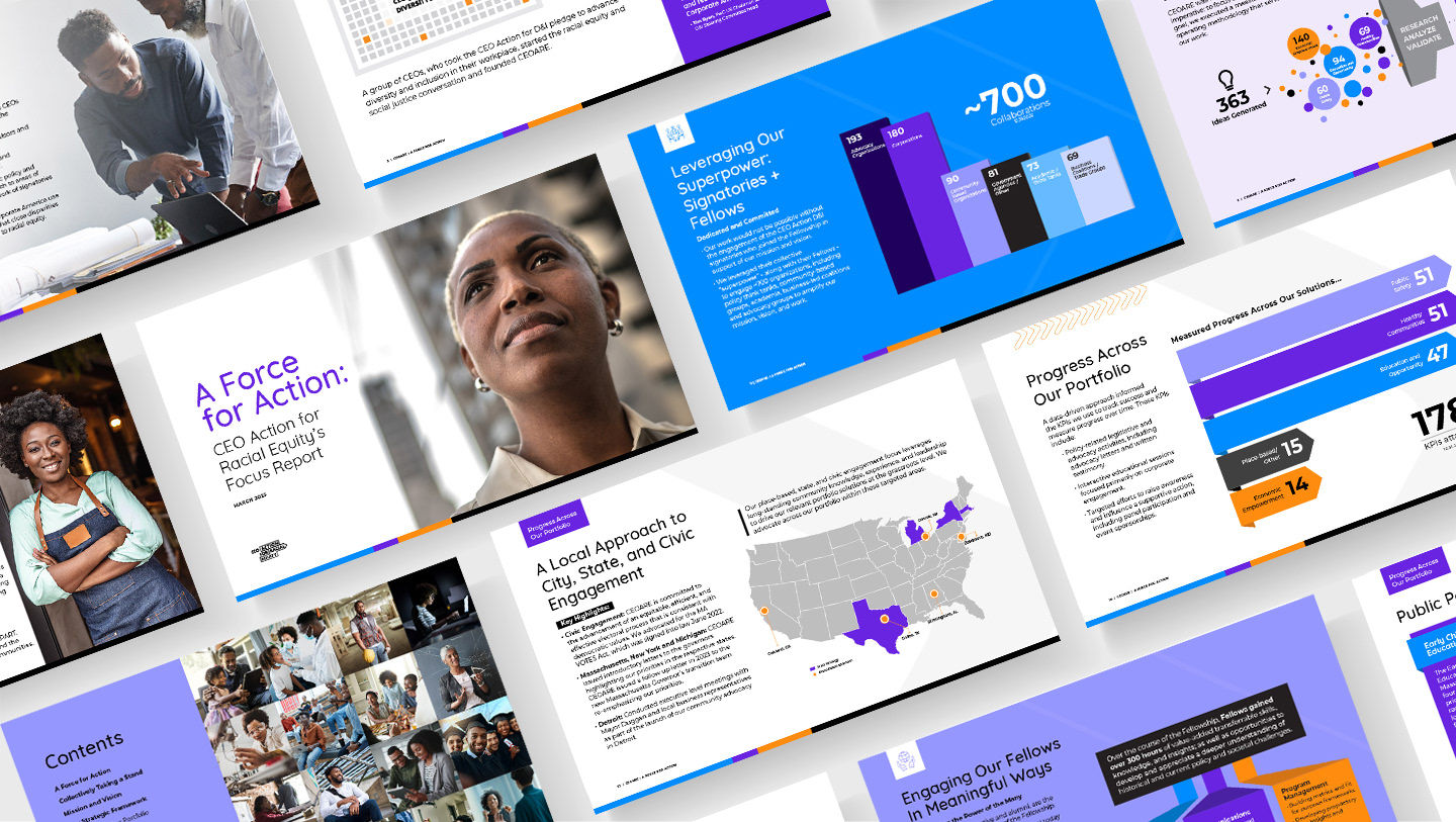 Delivered comprehensive visual program supporting CEO Action's growth from launch to 2,500+ CEO signatories. Flexible design system unified diverse Fortune 500 companies under common visual language while maintaining professional credibility for difficult conversations about inclusion. Work spanned business development, transparency reporting, and awareness building across years of coalition growth.